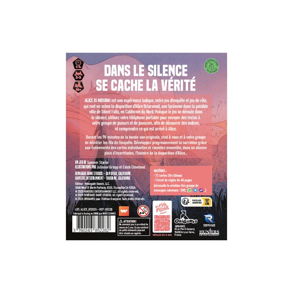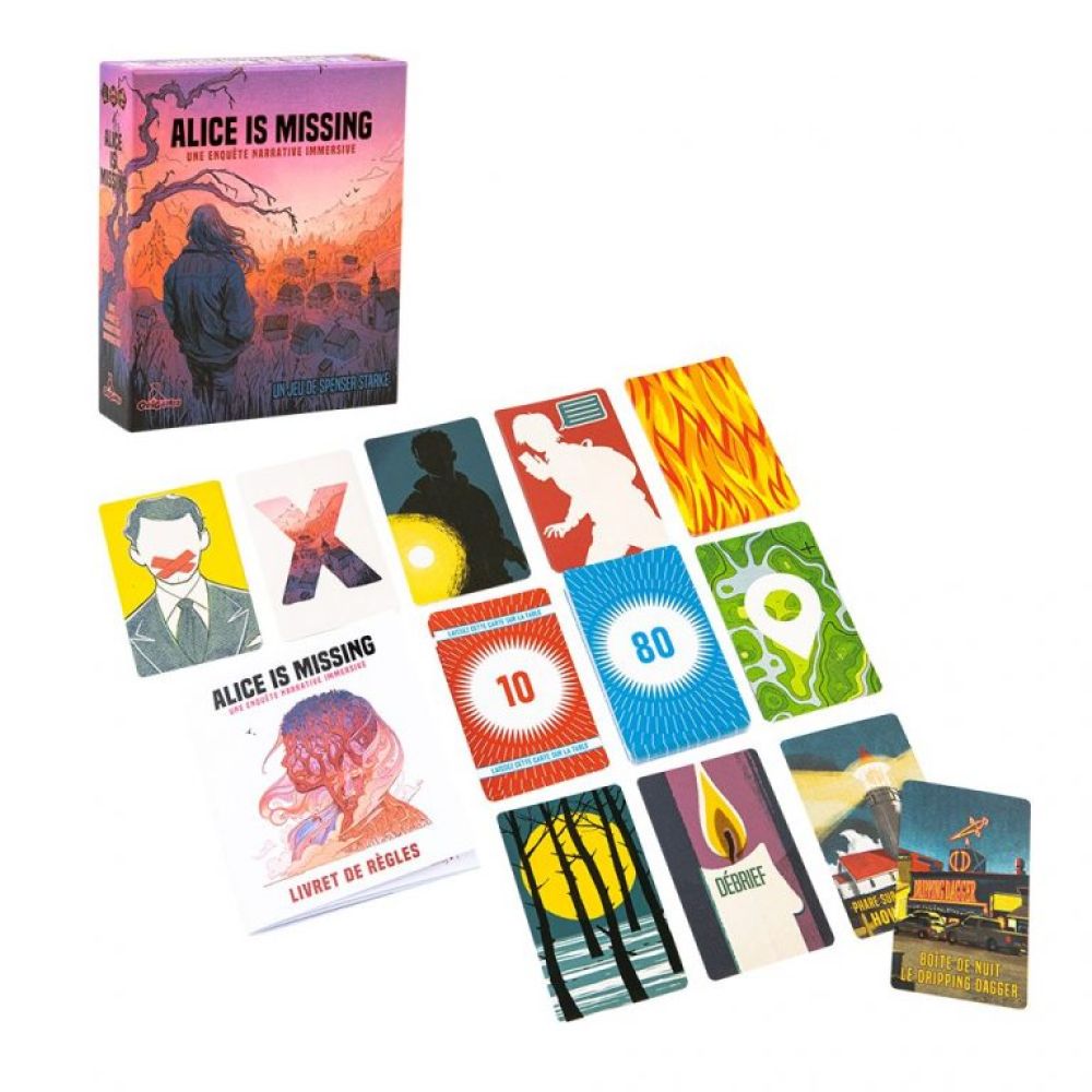 Durant les 90 minutes de la bande-son originale, c’est à vous et à votre groupe de démêler les fils de l’enquête. Développez progressivement la narration grâce aux événements des cartes individuelles et racontez ensemble, dans un silence plein d’incertitudes, l’histoire de la disparition d’Alice…