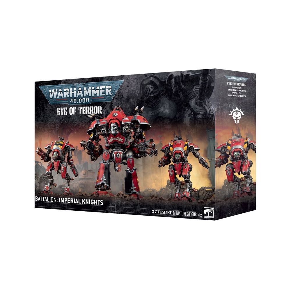 Cette boîte est idéale pour entamer une nouvelle collection de Chevaliers Impériaux, ou pour étoffer une armée existante, à déchaîner dans les parties de Warhammer 40,000 tout en faisant des économies sur l’achat des kits au détail. Deux Chevaliers de classe Armigère partent en avant-garde grâce à leur vitesse et leur agilité. Bien que plus petits que d’autres classes de Chevaliers, ils n’en restent pas moins des machines de guerre véritablement dévastatrices. La vedette de la boîte est un énorme Chevalier Vaillant, qui peut autrement être assemblé comme un Chevalier Castellan. Ces harnois colossaux dominent le champ de bataille, et sont parfaits pour représenter un Détachement de Compagnie de Sans-fief, dont les règles se trouvent dans Eye of Terror: Règne de Fer – Détachements, disponible séparément, ainsi que sur le site Warhammer Community.