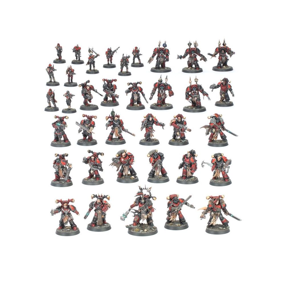 Cette boîte pleine à craquer est idéale pour entamer une nouvelle collection de Space Marines du Chaos sur le thème des Red Corsairs ou étoffer une armée existante, à déchaîner dans les parties de Warhammer 40,000 tout en faisant des économies par rapport à un achat des kits au détail. Cette force sauvage est menée par un Capitaine-Écumeur Red Corsair, un guerrier impitoyable qui règne d’une main de fer. Il est accompagné de Pillards Red Corsairs, des Space Marines renégats qui ont renoncé à leurs serments pour suivre le Tyran de Badab. Légionnaires vétérans et Terminators du Chaos comptent parmi les partisans de Huron Blackheart, renforçant les Red Corsairs par leurs nombreuses années d’expérience guerrière. Les Gardes Renégats sont parfaits pour tenir les objectifs ou se jeter sur l’ennemi pour l’affaiblir. Le tout forme une force cruelle et terrifiante, idéale pour représenter un Détachement de Bande de Renégats, dont les règles se trouvent dans The Maelstrom: L’Antre du Tyran – Détachements, disponible séparément.