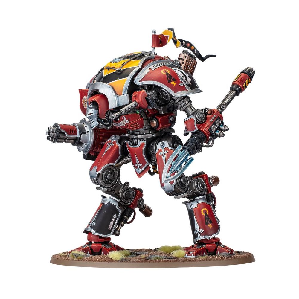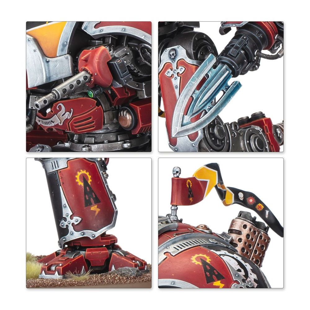Les jambes de la figurine permettent deux poses pleines de détermination, ainsi qu’une option avancée pour les hobbyistes Warhammer les plus expérimentés. Le kit propose trois masques différents, et l’écoutille peut être assemblée fermée ou ouverte, pour révéler l’intérieur détaillé et le pilote. Le Chevalier peut être armé soit d’un canon gatling châtieur, à plusieurs fûts tirant des munitions de gros calibre pour faucher l’infanterie, soit d’une bombarde Frag tirant des obus explosifs. Pour compléter cela, vous trouverez une énorme lance Choc du Tonnerre accélérée par une fusée pour transpercer les blindages renforcés, ou une tronçonneuse Reaper polyvalente pour découper les hordes ou éviscérer les créatures monstrueuses d’un seul coup. Ces armes peuvent être montées sur n’importe lequel des deux bras, ce qui vous permet de personnaliser facilement votre machine de guerre dévastatrice, et la lance Choc du Tonnerre offre deux options d’assemblage.