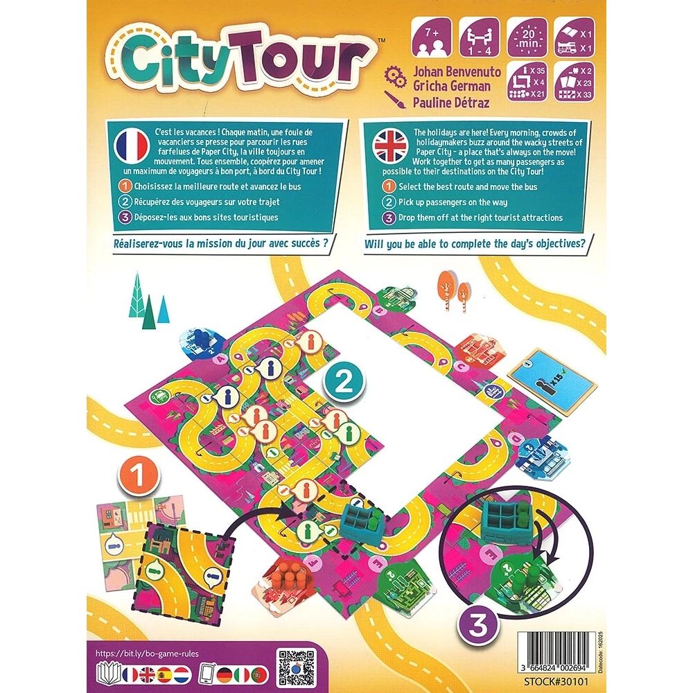 City Tour se d?roule en 12 journ?es r?parties en 4 niveaux de difficult? progressive. Chaque journ?e propose des objectifs diff?rents, ajoutant de nouvelles r?gles et de nouveaux d?fis : contr?le surprise des tickets, d?viation, gare obligatoire, afflux de grands voyageurs ou encore un stade ? remplir de fans. ? chaque partie, vous devrez trouver le meilleur itin?raire, optimiser vos trajets et coop?rer pour que le bus atteigne sa destination avec un maximum de passagers satisfaits.
