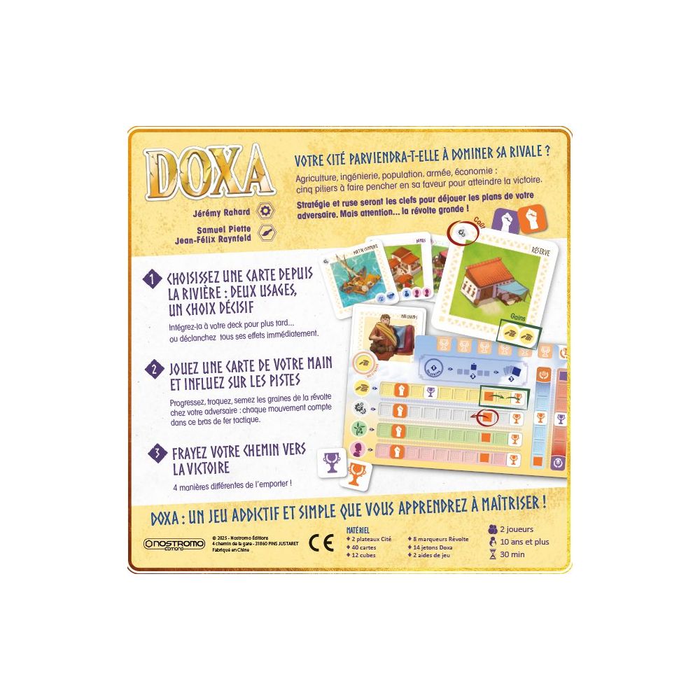 Chaque carte ayant un «coût d’entretien» obligatoire et des effets lorsqu’elle est jouée, à vous de bien équilibrer la gestion de votre deck pour que votre cité ne sombre pas dans le chaos ou que l’armée de votre adversaire ne l’envahisse. L’observation de la cité adverse et de la stratégie de votre adversaire est l’une des clés de votre victoire.