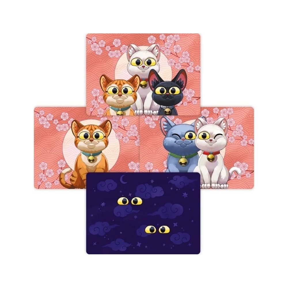 les cartes du jeu représentent des Paires d’yeux dans la nuit sur leur Recto (entre 1 et 3 paire d’yeux) et des mignons chatons sur leur verso.