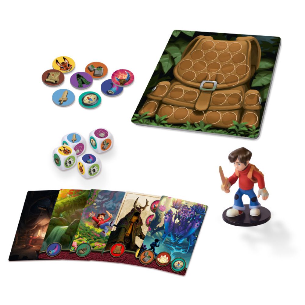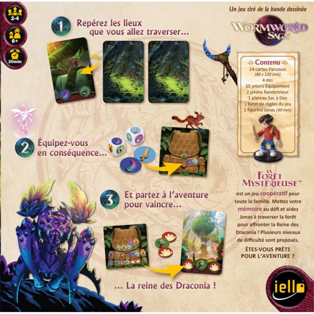 Accompagne Jonas dans un voyage aussi merveilleux que périlleux ! Après avoir traversé un tableau magique, Jonas se retrouve plongé dans un univers fantastique. Aidez-le à traverser la grande Forêt Mystérieuse et affrontez ensemble la Reine des Draconia, une des créatures les plus dangereuses de cette forêt. Principe du jeu Le jeu se déroule en 3 phases : Phase 1 : Une par une, retournez les cartes et observez le Parcours pour mémoriser les différents Équipements dont vous avez besoin pour votre aventure. Phase 2 : Lancez les 4 dés. Le résultat des dés vous indique quels équipements-vous sont proposés pour l’expédition. Choisissez-en 2 et posez-les sur le Sac à Dos aux emplacements prévus. Phase 3 : Partez explorer la Forêt Mystérieuse. Révélez une par une les cartes du parcours, et déposez les équipements qui y sont indiqués. Lorsque tous les éléments d’une carte parcours sont complétés, vous pouvez passer à la suivante. Faites marcher votre mémoire, et tous ensemble rappelez-vous quels sont les équipements dont Jonas a besoin pour traverser la forêt et affronter la méchante Reine Draconia.