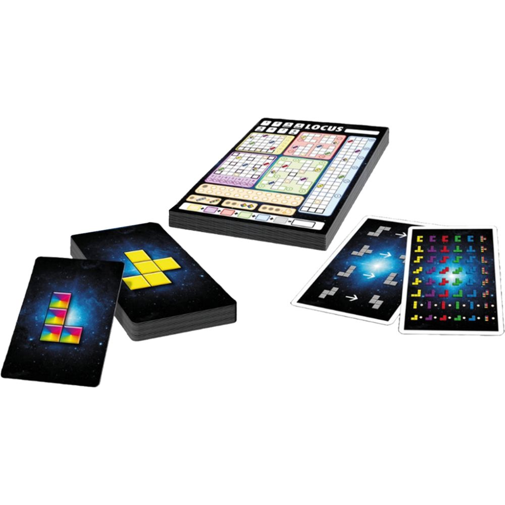 Locus est un jeu de flip & write et de draft dans lequel vous choisissez des formes colorées façon pièces de Tetris à placer sur votre feuille de score. Choisissez bien les cases que vous cochez pour marquer des points, obtenir des pièces et des blocs bonus, et surtout ne pas vous retrouver bloquer ! Chaque zone de la grille a sa propre manière de scorer. Les stratégies sont nombreuses dans ce jeu familial et accessible !