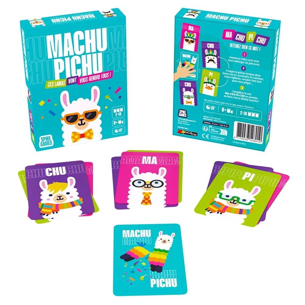 Machu Pichu est un jeu de cartes et d’ambiance rapide et délirant pour 2 à 10 joueurs. Dans ce jeu de société, affrontez vos amis dans une course effrénée pour vous débarrasser de vos cartes en repérant les bons lamas… et soyez prêts à frapper la piñata au bon moment pour gagner !