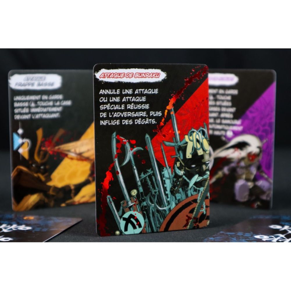 Dans le jeu Okko, chaque joueur possède une main de cartes représentant des mouvements, des attaques ou des attaques spéciales sur le champ de bataille.