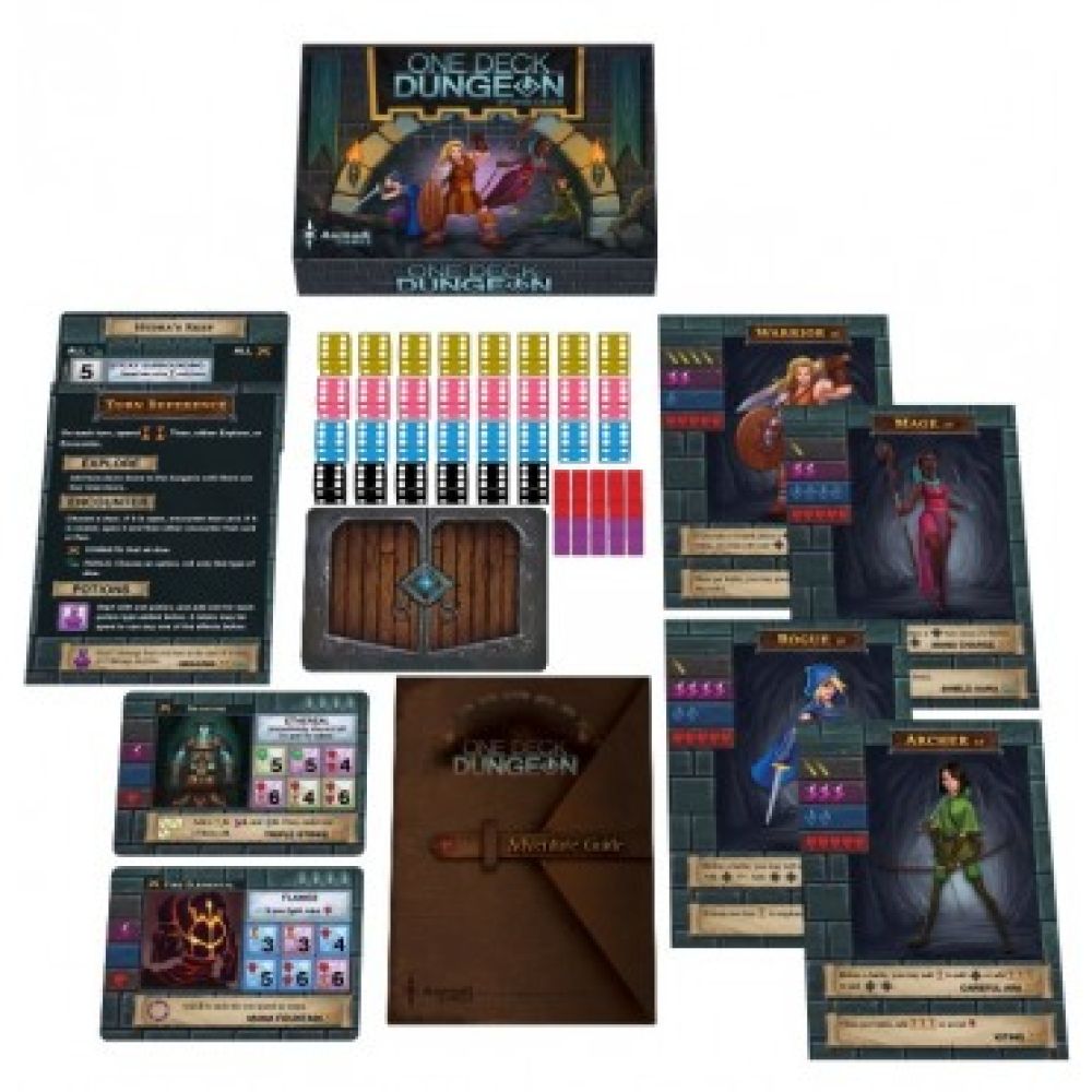 One Deck Dungeon est livré avec 44 cartes rencontres, 5 cartes souterrains/monstres, 4 cartes niveaux, 2 cartes aptitudes de base et la non moins importante carte d’escaliers, sans laquelle vous seriez bloqué sur le premier niveau pour toujours. Sont également inclus six cartes grand format : une pour chacun des cinq héroïnes et une sixième qui sert de références de tour. Pour les combats, il y a 30 dés de quatre couleurs. Des marqueurs de santé pour indiquer les dégâts de vos héroïnes quand ça se passe mal lors des combats, et des cubes de potions quand vous voulez guérir ou faire d’autres choses incroyables.