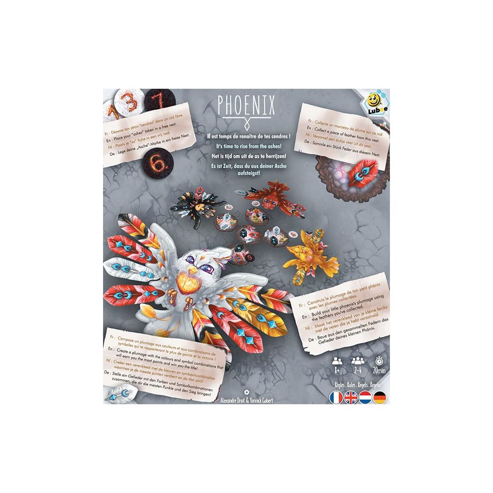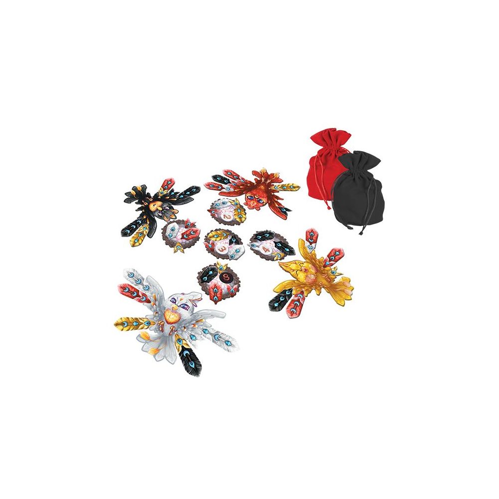 « Phoenix » invite les joueurs à composer leur phénix avec les plus jolies plumes. Collecter celles qui rapportent le plus de points pour remporter la partie. Il va falloir aller chercher les plumes dans les nids des autres ou le nôtre. Mais attention, si vous allez chercher une plume chez vous, vous serez peut-être le dernier à jouer. En effet, pour sélectionner une plume, chaque joueur possède un jeton avec l’ordre du tour de jeu. En prenant une plume chez un adversaire, vous lui donnez votre jeton, donc votre place dans le tour. Si vous jouez chez vous, vous allez devoir le retourner et reculer encore plus dans l’ordre du tour. Tout se joue dans la stratégie entre rester dans les premiers à sélectionner une plume, ou prendre une plume super intéressante.