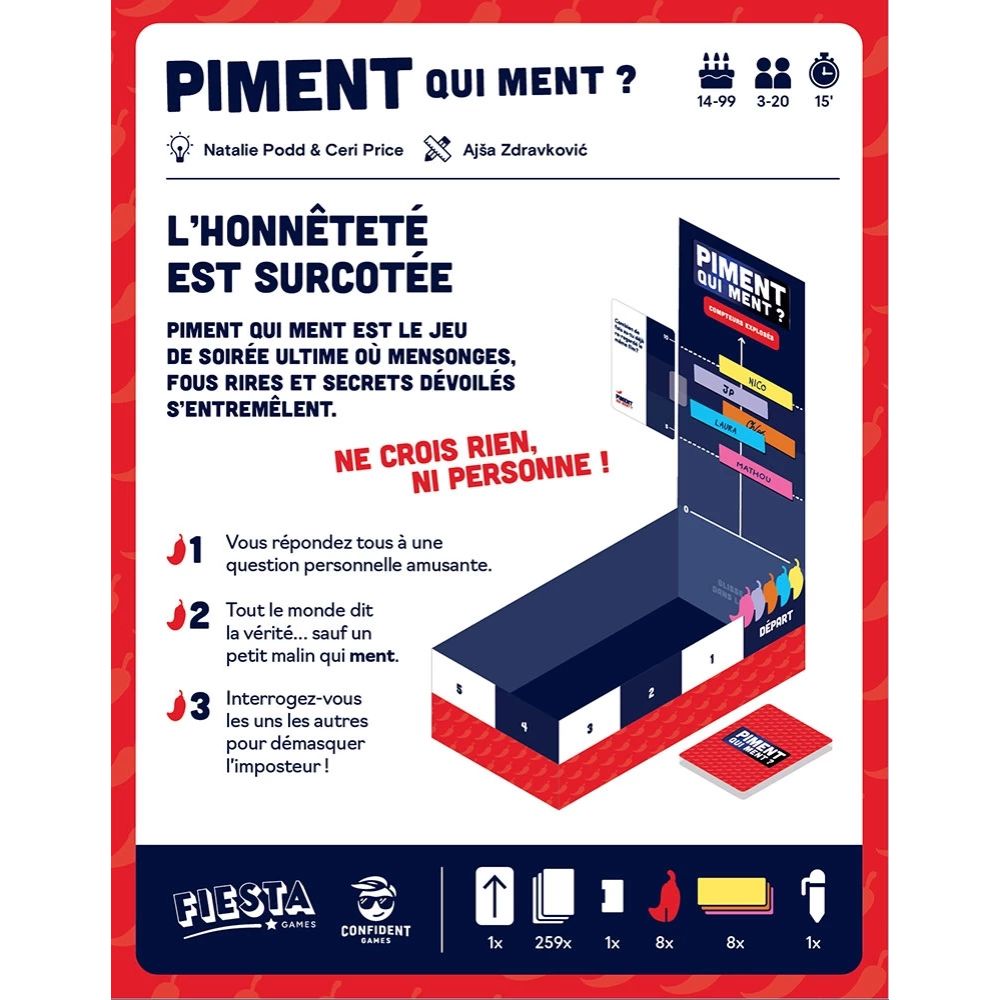 Piment qui ment ? est un jeu d’ambiance pour 3 à 20 joueurs. Dans ce jeu de bluff, tout le monde répond à une question personnelle… mais l’un des joueurs ment. Vous devrez écouter, observer et débattre pour démasquer l’imposteur, tout en assumant vos propres réponses parfois… un peu gênantes !