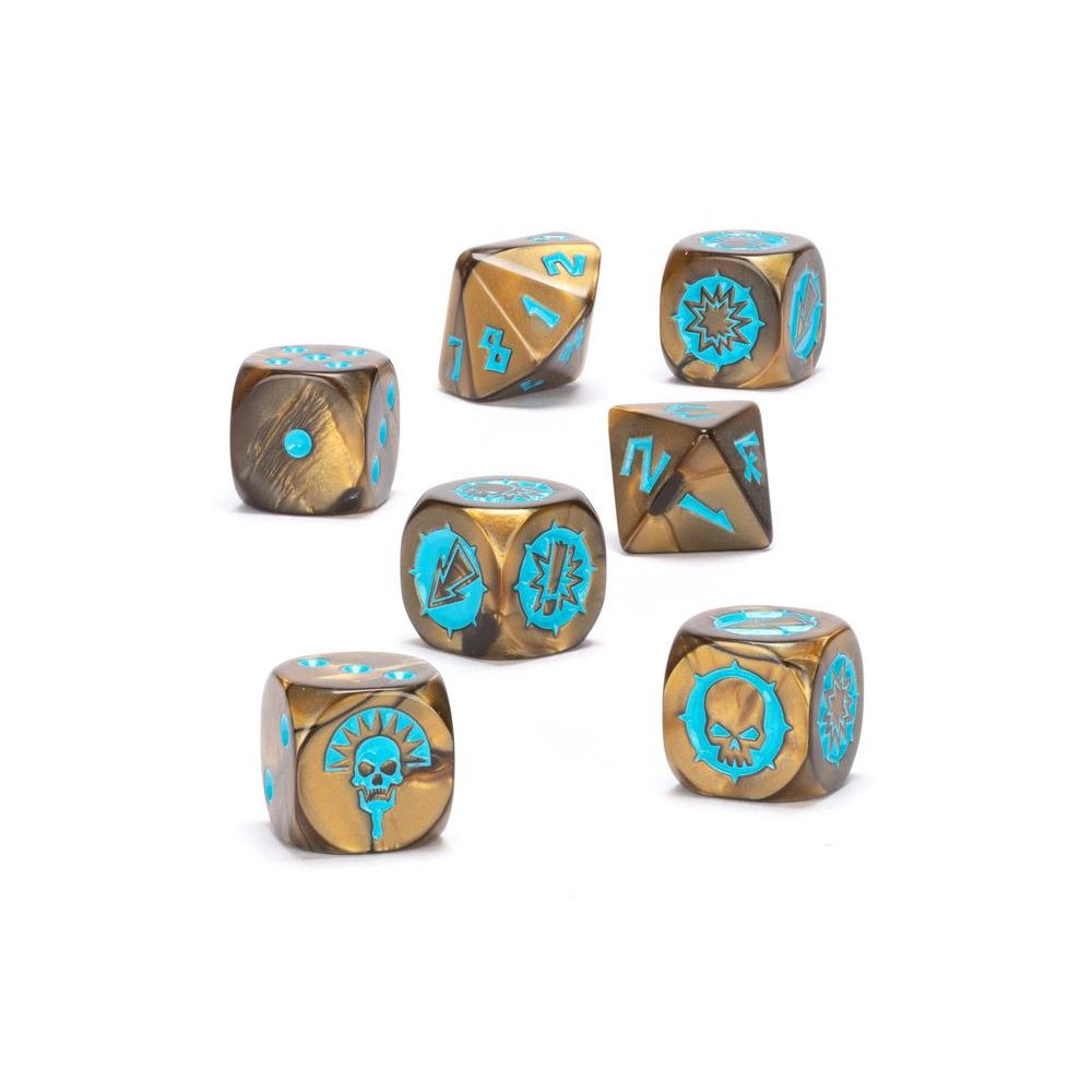 Ce set de 7 d?s aux ar?tes arrondies sur le th?me des Rois des Tombes est ? utiliser dans les parties de Blood Bowl. Les d?s sont moul?s en plastique acrylique brun et dor? ? volutes et avec des marquages turquoise. Les d?s ? six faces mesurent 16mm de c?t?, le d? ? huit faces mesure 14,5mm et le d? ? seize faces mesure 17,4mm. Sur les D6 standards, les faces 1 ? 5 ont des marquages traditionnels, tandis que la face du 6 arbore l’ic?ne immortelle des Rois des Tombes.