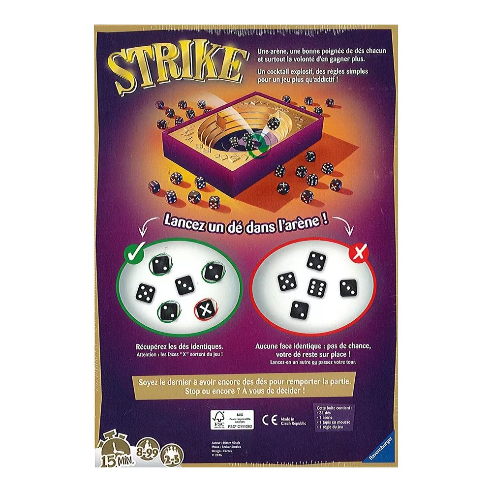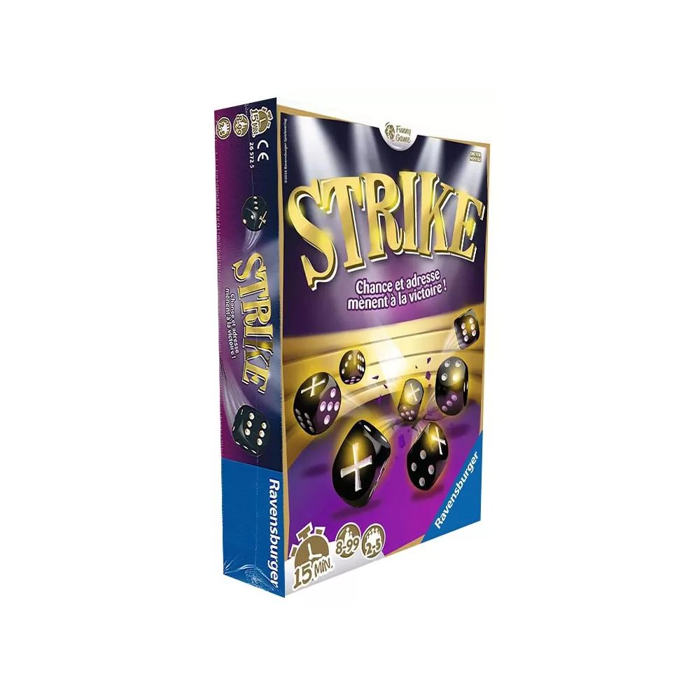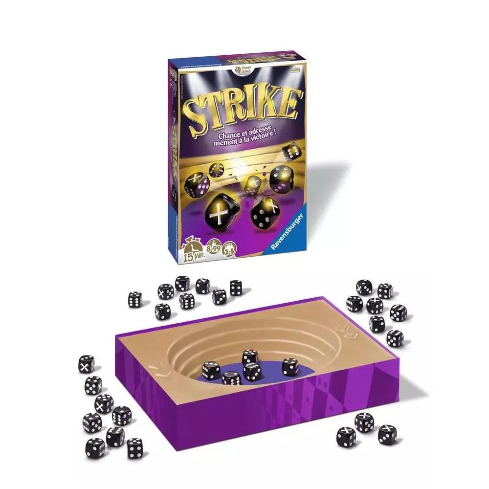 Dans le jeu de d?s Strike, vous devez lancer un d? dans l’ar?ne, r?cup?rer les d?s identiques ou les laisser s’il n’y a pas au moins un double ! Soyez le dernier ? avoir encore des d?s pour remporter la partie. Alors Stop ou Encore ? D?cidez-vous mais gare au danger de tout perdre !