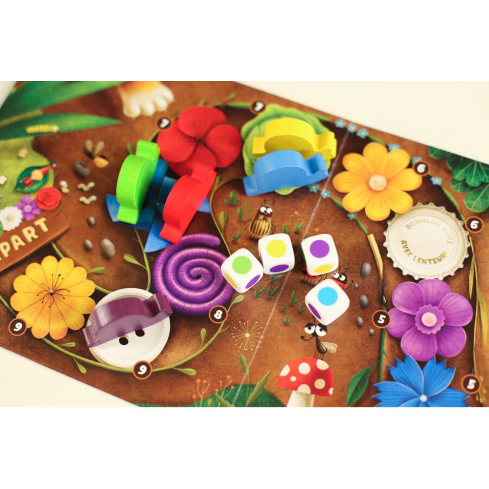 Une ode à la lenteur qui fait du bien dans notre société où tout est devenu urgent. La couleur de votre escargot est secrète. À votre tour, lancez les 4 dés de couleurs. Chaque dé permet de déplacer un escargot s’il est de la couleur indiquée ou s’il se trouve sur une fleur de la couleur du dé.